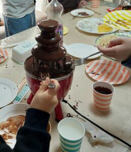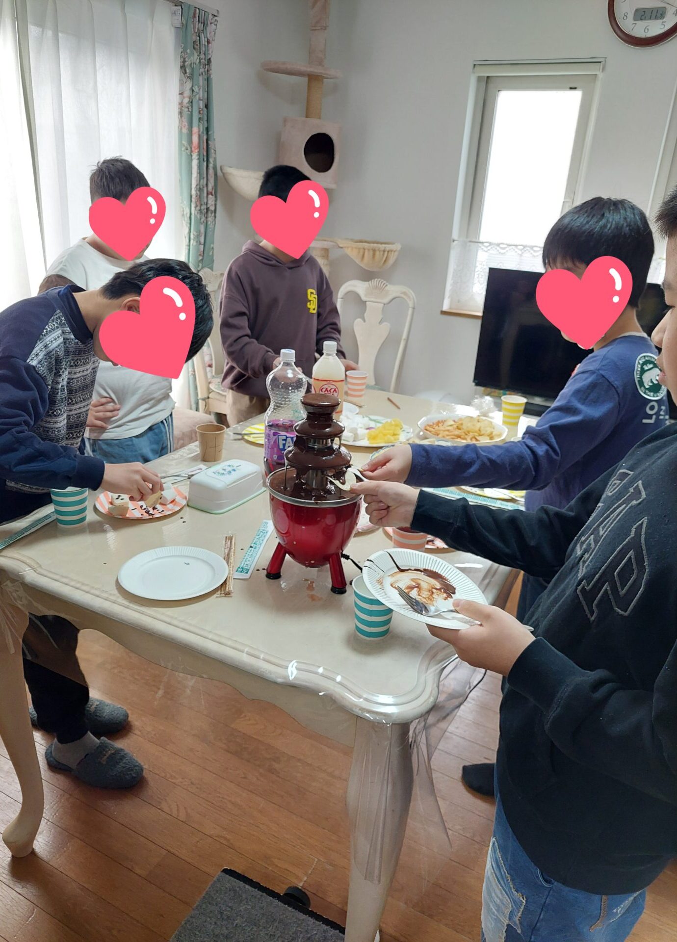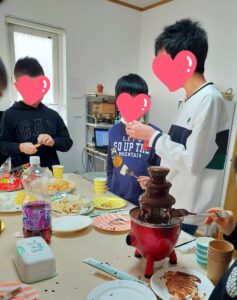 バレンタインパーティー 掲載日:2026年02月21日 男子生徒の交流のための、バレンタインパーティー❤ なぞなぞ・作曲家クイズ・ト音記号速書き競争・鍵盤の端から端まで弾くタイムトライアル・雅代先生クイズ(笑)などで楽しい時間を過ごしました。チョコレートファウンテンや流しそうめんなどを食べながら、初対面でもすぐに仲良くなれるのが男子のいいところですね。